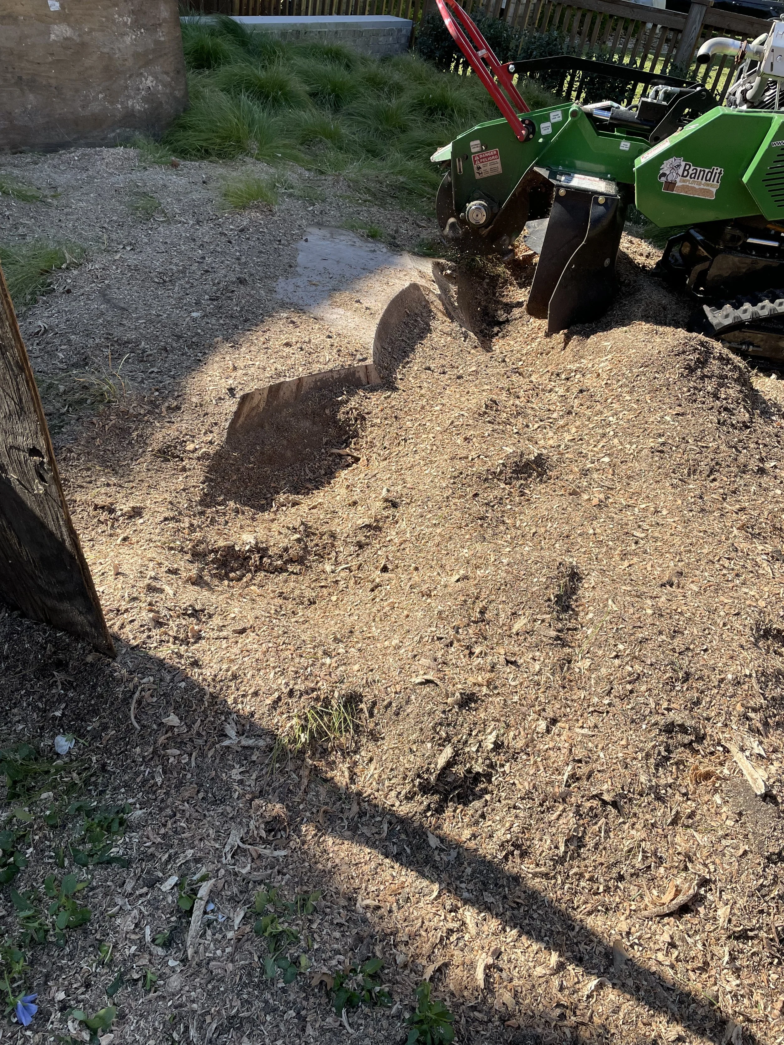 We use a specialized stump grinder to effectively grind a tree stump, allowing the cleared area to be repurposed for activities such as planting another tree, cultivating grass, or simply leaving it untouched.